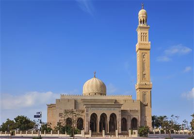Die prachtvolle, 1975 erbaute Moschee ist ganz in Weiß gehalten, in Fatimiden-Tradition, nur durch wenige goldene Elemente unterbrochen. Zwei schlanke, 70 Meter hohe Minaretten säumen die gewaltige Mittelkuppel der Moschee und zeigen gleichzeitig den Haupteingang an. Rund 1.200 Gläubige finden in der märchenhaft schönen Moschee Platz.