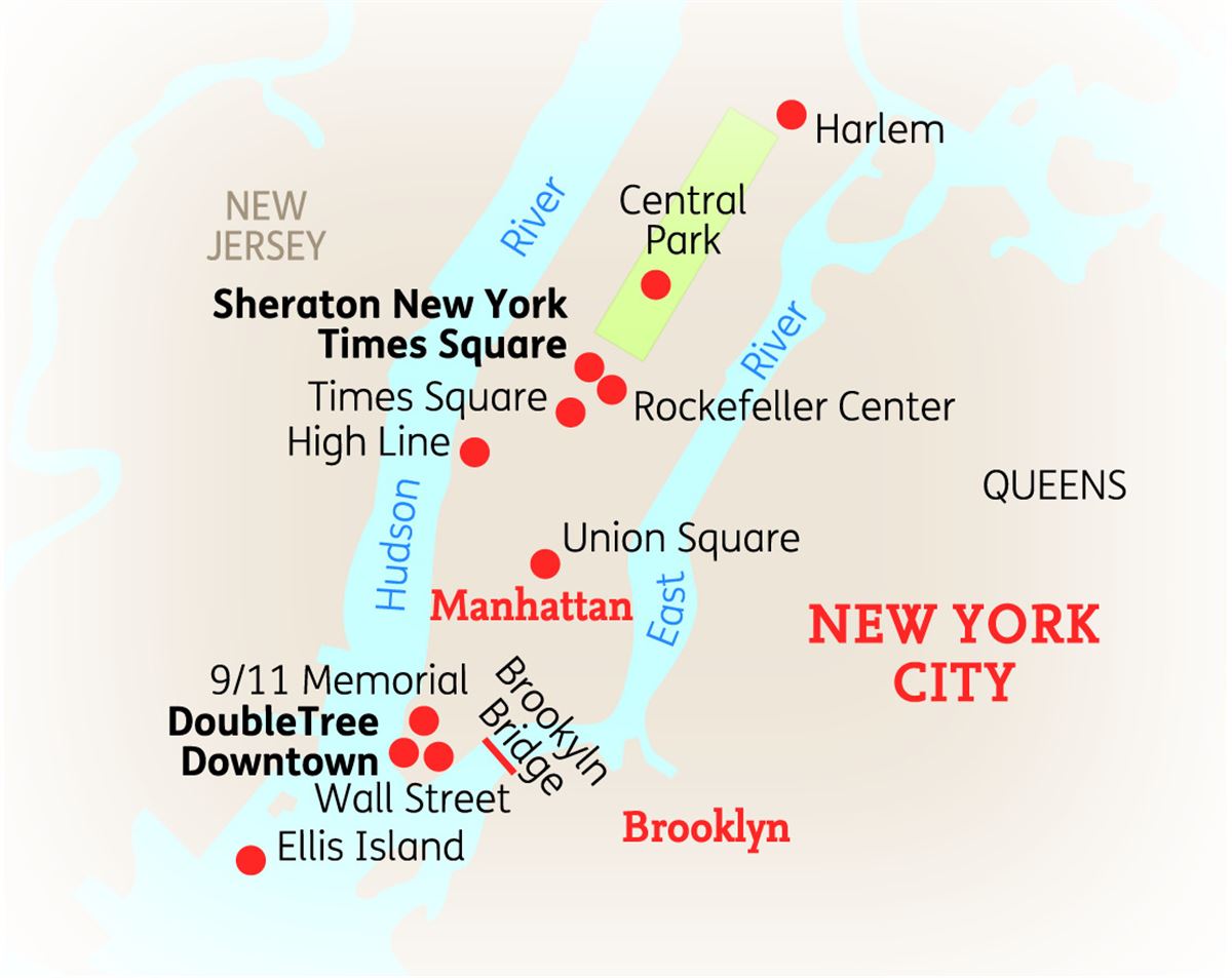Nachmittags erwartet Sie auf der anderen Seite des East Rivers der Stadtteil Brooklyn, der ein ganz eigenes Flair besitzt und unter anderem für seine Architektur und Vielfalt bekannt ist. Dort lernen Sie Dumbo kennen, das sich zu einem Künstlerviertel entwickelt hat. Der Name ist eine Abkürzung für „Down Under the Manhattan Bridge Overpass“, was sich durch seine direkte Nähe zur Manhattan und Brooklyn Bridge erklärt. Genießen Sie von der Brooklyn Heights-Promenade einen tollen Ausblick auf die Skyline Manhattans. Ihre Tour endet am beliebten Hard Rock Café, wo Sie sich von Ihrer Reiseleitung verabschieden. Den letzten gemeinsamen Abend verbringen Sie in einem landestypischen Restaurant. (F/A)