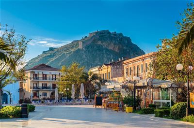 In Nafplio können Sie entlang der Stadtmauer mit ihren Wehrtürmen und Toren einen Spaziergang machen und dabei in der Innenstadt an der Kirche St. Spiridonas vorbeischlendern.