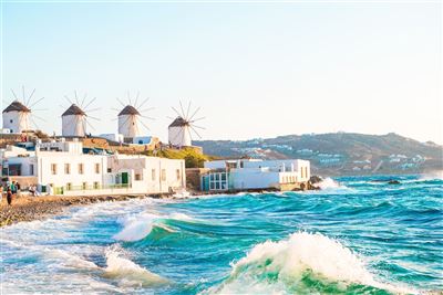 Die nach Apollos Enkel Mykons benannte Insel ist für ihre weißen Häuser mit blauen Türen und Fenstern, engen Gassen sowie trockenen, sonnigen Landschaften bekannt –