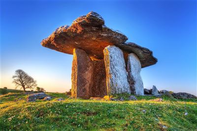 Der Burren, eine einzigartige Karstlandschaft in County Clare, ist ein geologisches Wunder mit nackten Kalksteinterrassen, die vor 350 Millionen Jahren entstanden sind. Diese "mondähnliche" Landschaft beherbergt eine erstaunliche Vielfalt seltener Pflanzen, darunter alpine und mediterrane Arten, die normalerweise nicht in derselben Region vorkommen. Poulnabrone, ein 5000 Jahre alter Portaldolmen im Herzen des Burren, ist eines der ältesten Denkmäler Irlands.