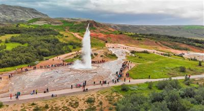 Im relativ regelmäßigen Abstand von drei bis fünf Minuten bricht der Strokkur aus. Hin und wieder kommt es vor, dass er sogar dreimal nacheinander ausbricht. Die imposante Säule aus Dampf und Wasser erreicht eine Höhe zwischen 25 und 30 Metern. Neben dem Strokkur befindet sich der sogenannte Große Geysir, welcher aber nur noch selten ausbricht.