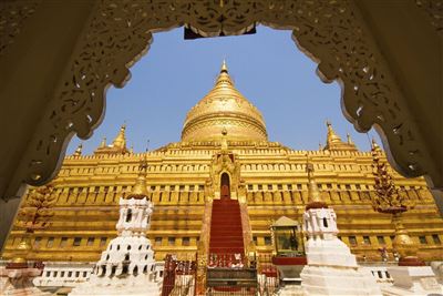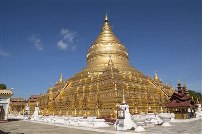 Im Zentrum Myanmars, nahe der Stadt Bagan befindet sich der kleine Ort Nyaung-U, welcher die höchst imposante Shwezigon Pagode beheimatet. Schon von weitem erkennt man die hoch in den Himmel ragende goldene Kuppel dieser einzigartigen Pagode, deren Bau bereits zu Beginn des 12. Jahrhunderts in Auftrag gegeben wurde. Der Legende nach, soll sich in der Shwezigon Pagode sowohl ein Knochen als auch ein Zahn des Buddha befinden, daher verwundert es nicht, dass jährlich Tausende Gläubige nach Nyaung-U pilgern. Um die goldene Stupa der Shwezigon Pagode herum befinden sich zahlreiche kleinere Tempel und Schreine.