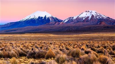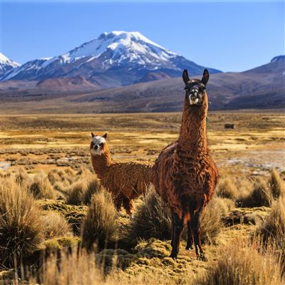 Der Vulkan Parinacota liegt im Nationalpark Lauca in der Atacama-Wüste, an der Grenze zwischen Bolivien und Chile. Diese Attraktion Ihrer Bolivien Rundreise ist ein ganz besonders eindrucksvolles Naturschauspiel: Der Vulkan selbst ist ein sogenannter Schichtvulkan, erkennbar an seiner enorm spitzkegeligen, steilen Form. Davor erstreckt sich zu Füßen des mächtigen Vulkans der Lago Chungará, einer der am höchsten gelegenen Seen der Welt. So entsteht ein atemberaubender Anblick, wenn sich die helle Vulkanspitze im kristallklaren Wasser des Sees spiegelt. Das, was dem Vulkan auch heute noch innewohnt, bezeichnen Experten als "Fumarolenaktivität". Eine Fumarole beschreibt hierbei einen Ausstoß von Wasserdampf und zum Teil auch vulkanischen Gasen. Beliebte Aktivitäten sind neben einer Vulkanbesteigung auch Wanderungen auf dem Spazierweg, der um den See führt, oder Mountainbiken.
