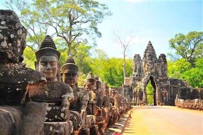 Von Phnom Penh aus führt der Weg weiter nach Siem Reap, dem Ausgangspunkt für die Erkundung von Angkor Wat und den umliegenden Tempeln. Neben Angkor Wat lohnt sich ein Besuch von Angkor Thom, der einstigen Hauptstadt des Khmer-Reichs. Besonders eindrucksvoll ist der Bayon-Tempel mit seinen riesigen in Stein gemeißelten Gesichtern. Ebenfalls beeindruckend ist Ta Prohm, ein Tempel, der fast vollständig von den Wurzeln riesiger Würgefeigen umschlungen ist – ein Bild, das an eine längst vergangene Zeit erinnert.