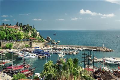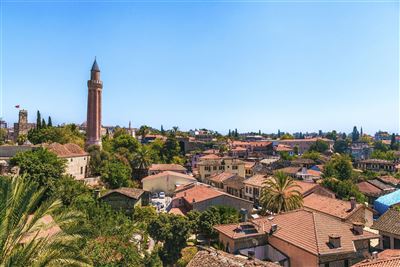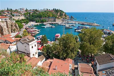 Die eigentliche Stadt Antalya liegt malerisch auf Steilfelsen, die ins Meer abfallen. Ob man sie schön findet, ist Geschmackssache. Antalya ist eine junge Stadt, die seit dem Ansturm der Touristen in den 1960er Jahren immer weiter wächst. Dabei wurde und wird leider die landestypische Architektur wenig berücksichtigt. Bettenburgen und Häuserblocks in Weiß prägen die Silhouette. Ein Stück der urigen Altstadt wurde nur am Hafen erhalten, wo auch viele schöne Cafés ihren Platz gefunden haben. Die alte Stadtmauer steht zum Teil noch und macht einen durchaus wehrhaften Eindruck.